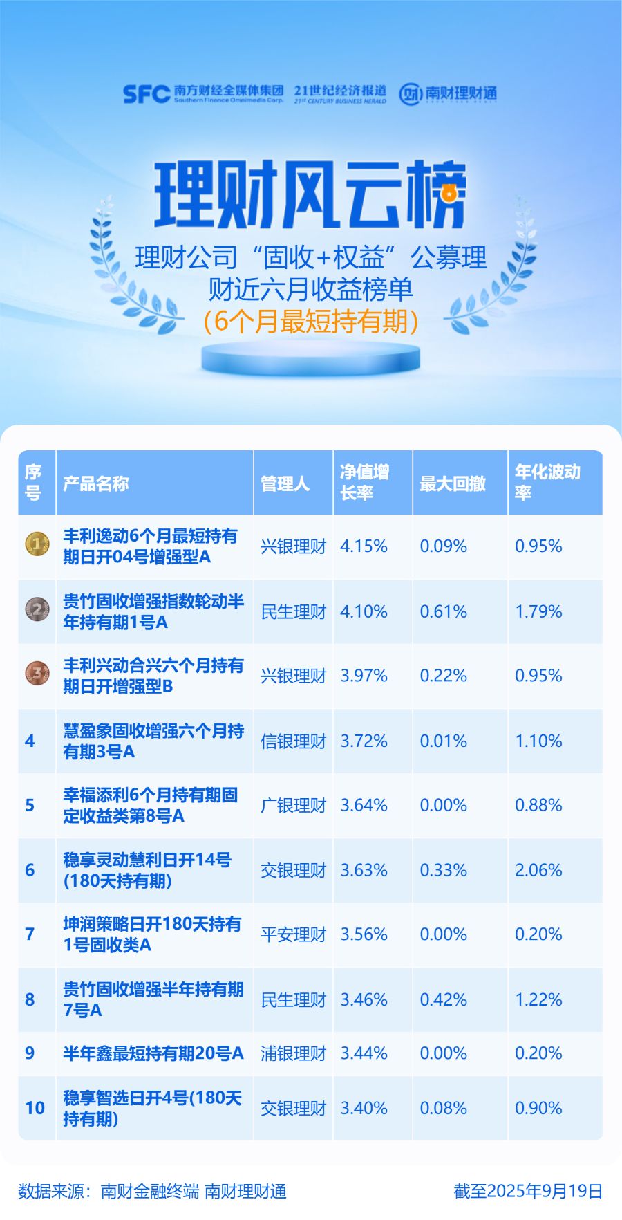 南财理财通数据显示,截至9月19日,在理财公司6个月最短持有期“固收+权益”公募理财近六月收益榜单中,兴银理财“丰利逸动6个月最短持有期日开04号增强型A”脱颖而出,以4.15%的近六月净值增长率位列第一,与此同时,该产品也展示了较好的回撤控制能力,同期最大回撤仅为0.09%。