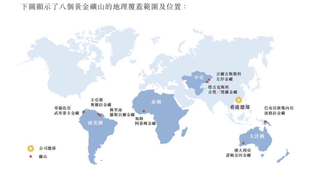 根据聆讯后资料集,其资产包涵盖8座海外高品位金矿,分布于南美洲、中亚地区、非洲和大洋洲等地,分别为武里蒂卡金矿、诺顿金田金矿、罗斯贝尔金矿、奥罗拉金矿、吉劳/塔罗金矿、阿基姆金矿、左岸金矿、波格拉金矿。