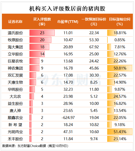 截至10月10日收盘,牧原股份股价报53.22元/股,总市值2907亿元,市盈率为10.47,暂居行业(猪肉股)最低位。
