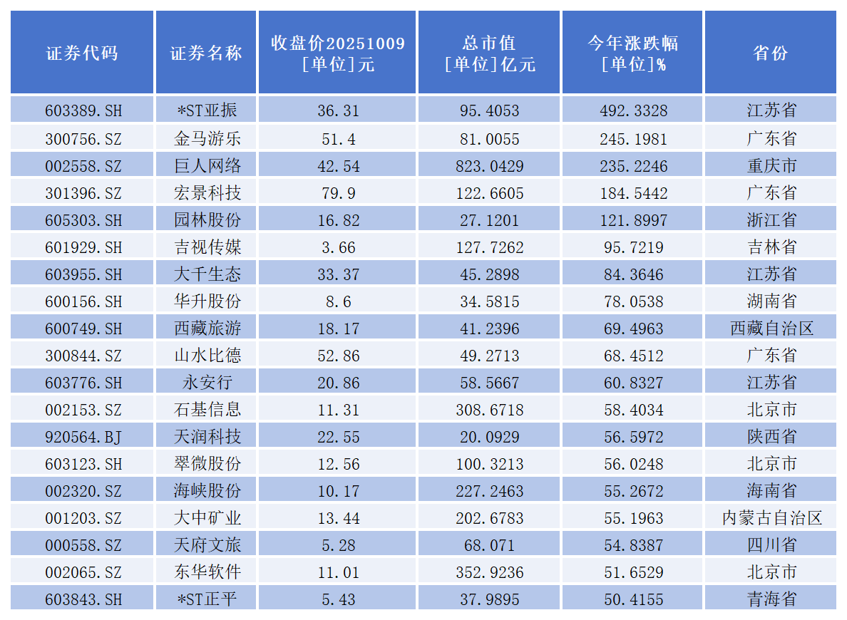 其中,*ST亚振(603389.SH)、金马游乐(300756.SZ)、巨人网络(002558.SZ)、宏景科技(301396.SZ)、园林股份(605303.SH)5家公司已经成功实现翻倍。