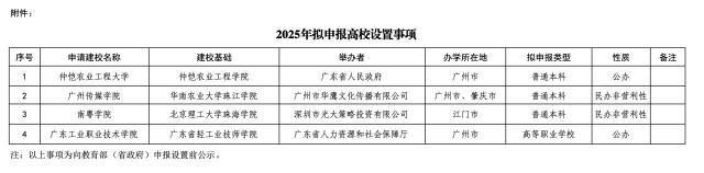 10月10日,广东省教育厅公示2025年拟申报高校设置事项。经省高等学校设置评议委员会专家考察和评议,仲恺农业工程学院拟更名为仲恺农业工程大学,华南农业大学珠江学院拟转设为广州传媒学院,北京理工大学珠海学院拟转设为南粤学院。此外,拟以广东省轻工业技师学院为基础设立广东工业职业技术学院。公示时间为2025年10月10日至10月15日。