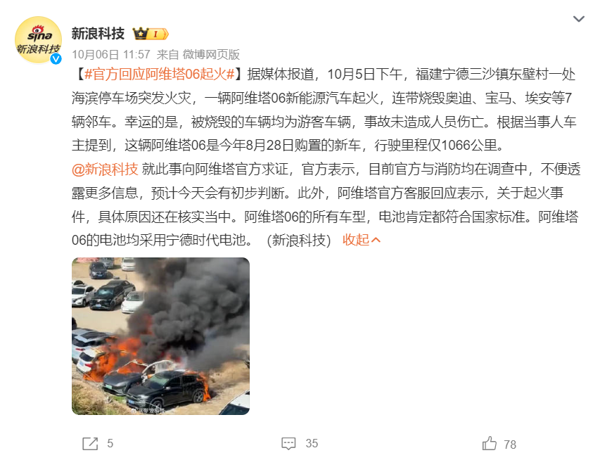 4天后,阿维塔另一款车型阿维塔06也发生了起火事故。网传视频显示,10月5日,福建省宁德市三沙镇东壁村,一辆阿维塔06停车时突然起火,引起周围7辆车着火爆炸,品牌包括奥迪、宝马、马自达、埃安等。