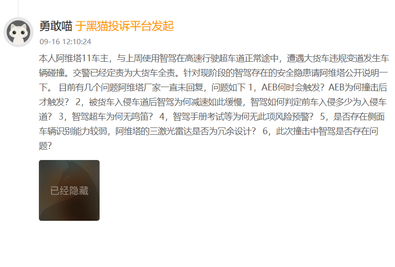 9月16日,一阿维塔11车主投诉称,使用智驾在高速行驶超车道正常途中,遭遇大货车违规变道发生车辆碰撞。其质疑,AEB何时会触发?AEB为何撞击后才触发?被货车入侵车道后智驾为何减速如此缓慢,智驾如何判定前车入侵多少为入侵车道?智驾超车为何无鸣笛? 智驾手册考试等为何无此项风险预警……