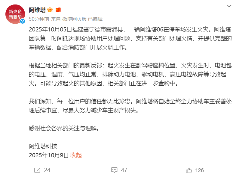 10月9日下午,阿维塔官方账号针对阿维塔06在停车场发生火灾事件发布了说明。其表示,团队已第一时间抵达现场协助用户处理问题;根据当地相关部门的最新反馈,排除动力电池、驱动电机、高压电控故障等导致起火;可能导致起火的其他原因,相关部门正在进一步查验中。