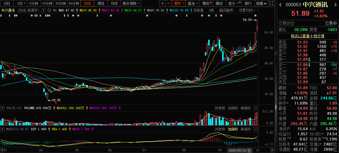 2025年10月10日,中兴通讯港股(00763.HK)以及A股(000063.SZ)股价双双大涨,截至记者交稿,A股股价逼近2020年的历史高位,港股股价创历史新高,报43.88港元/股。推动公司股价走强的催化剂,是公司在AI算力领域的全栈布局引发市场关注。