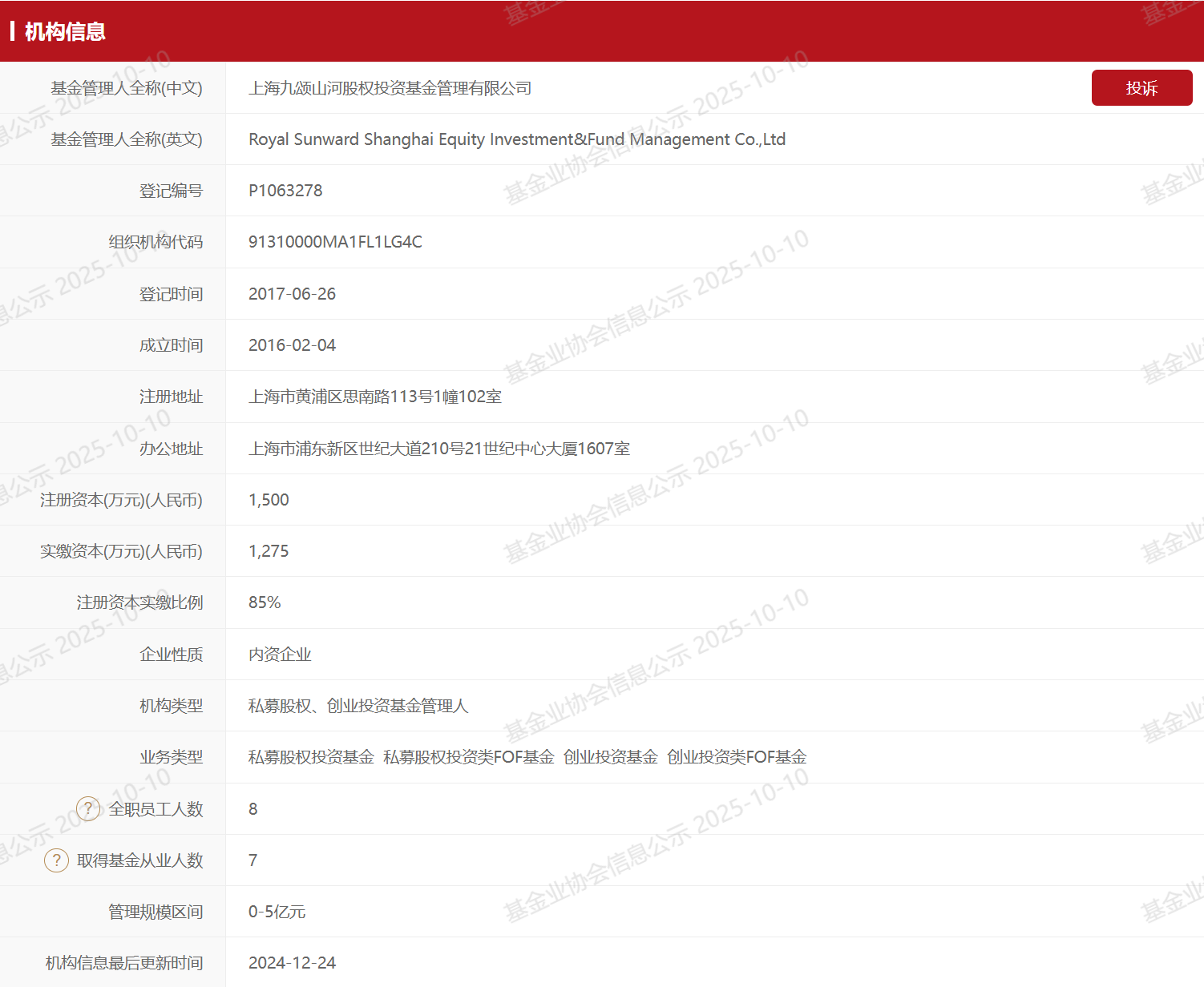 工商注册信息显示,上海九颂山河股权投资基金管理有限公司的注册资本为1500万元,实缴资本1275万元;公司法定代表人为涂丽萍,经营范围包括股权投资管理、资产管理。