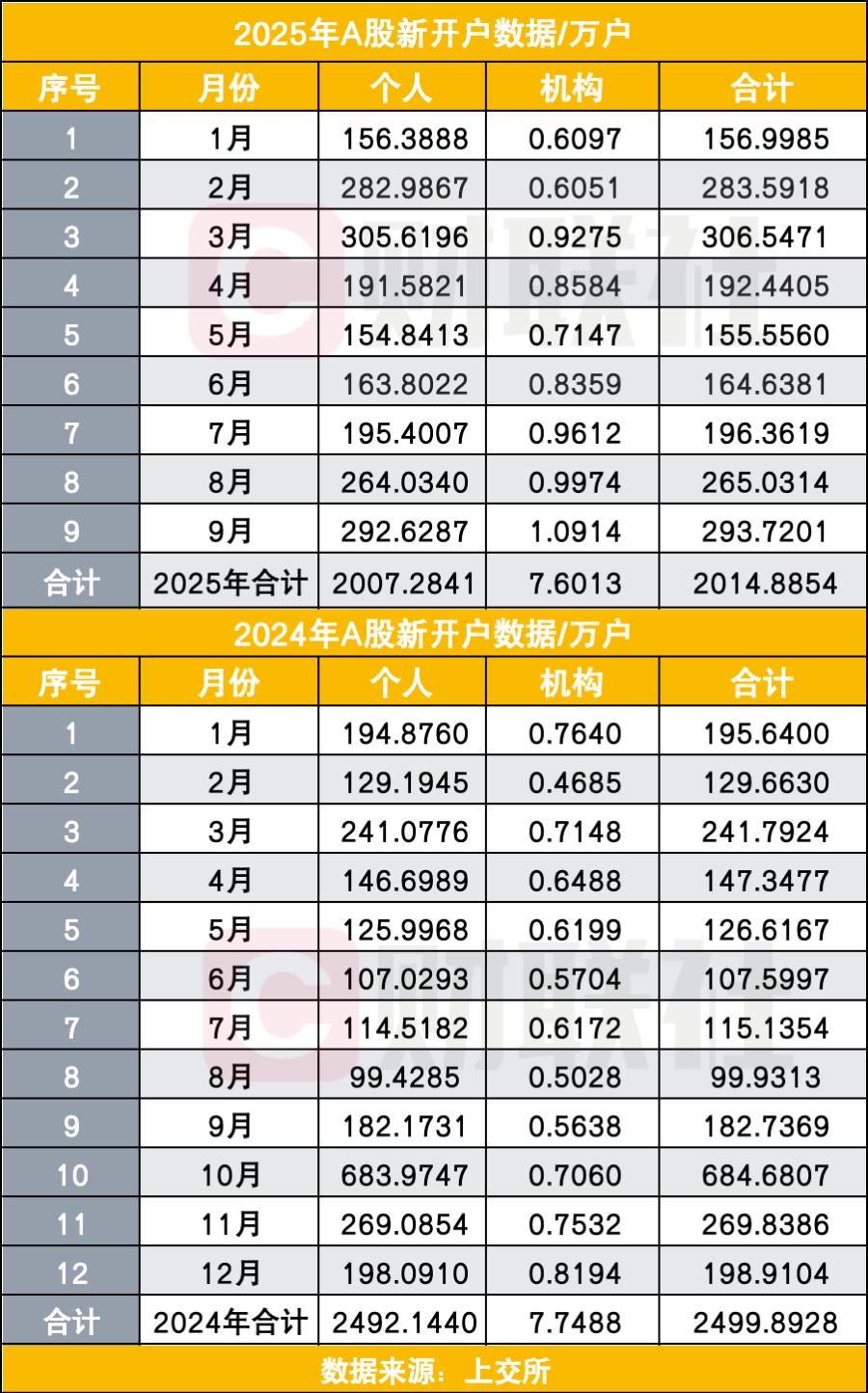2025年9月A股新开户294万户,同比大幅增长61%。2025年前三季度已累计新开2015万户,同比增长50%。从月度对比来看,2025年1月A股新开157万户,2月新开284万户实现近翻倍增长,3月突破300万户,4月因关税摩擦市场震荡环比下降37.22%,5月受假期影响进一步回落,6月、7月、8月新开户数加速回升,9月环比增长11%。与2024年9月新增183万户开户数相比,2025年9月新开户同比大增61%,远超去年同期开户水平。结合2024年全年开户数据来看,294万户高于去年的11个月份。