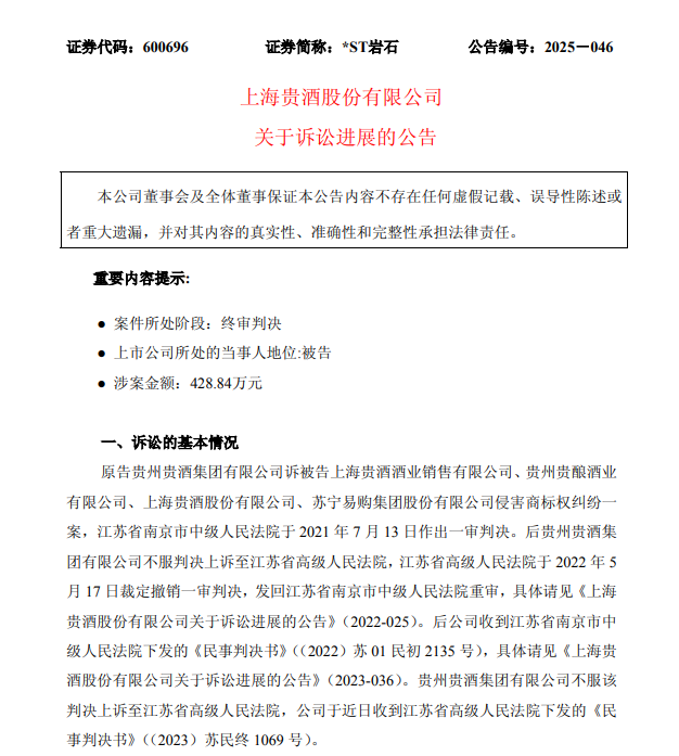 10月10日,上海贵酒股份有限公司(证券简称“*ST岩石”, 证券代码“600696.SH”)发布关于诉讼进展的公告。公告显示,上海贵酒与贵州贵酒关于“贵酒”商标纠纷一案的终审判决结果出炉,上海贵酒作为被告方败诉且需赔偿贵州贵酒相关经济损失,且不得使用“贵酒”这一企业名称。