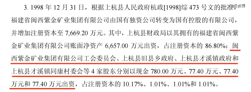 我们从当年招股书可瞥见这段往事的细节:1998年年底,才溪镇同康村委会以全村山林补偿款及少部分资金共77.4万元入股紫金矿业。2000年紫金矿业改制成股份有限公司,同康村将这77.4万股金加上股息分红和部分资产继续投入。