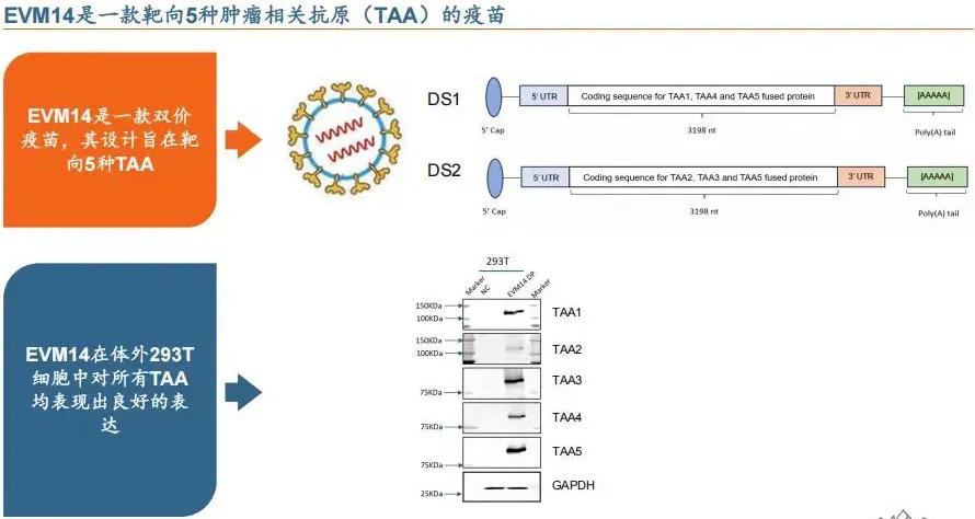 另一款通用型“现货”肿瘤疫苗EVM14,靶向5个肿瘤相关抗原,适用于鳞状非小细胞肺癌及头颈鳞癌,于7月底在中国获批临床,成为公司首个实现中美双报的mRNA肿瘤疫苗。