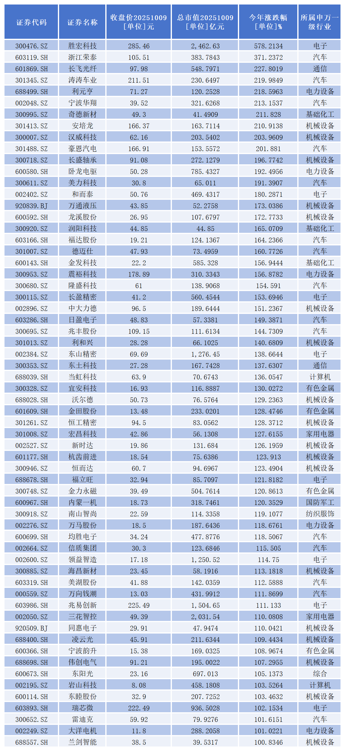 其中,胜宏科技(300476.SZ)、浙江荣泰(603119.SH)、长飞光纤(601869.SH)、涛涛车业(301345.SZ)、利元亨(688499.SH)、宁波华翔(002048.SZ)、奇德新材(300995.SZ)、安培龙(301413.SZ)、汉威科技(300007.SZ)、豪恩汽电(301488.SZ)10家公司股价涨幅均超200%。