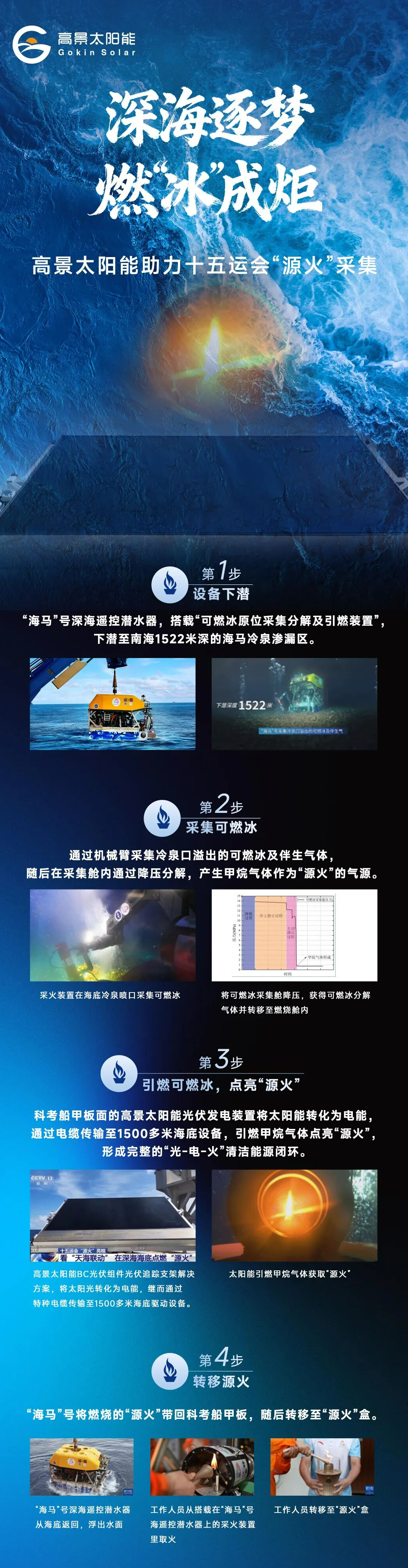 这一次,火种并非取自传统的地面火源,而是 来自南海深处的可燃冰,创造了全球首次“深海采火”的历史 。在这项突破性成就的背后,来自珠海的高景太阳能股份有限公司 凭借其BC(背接触)高效光伏组件与光伏追踪系统,为“源火”采集提供了稳定可靠的清洁能源支持。