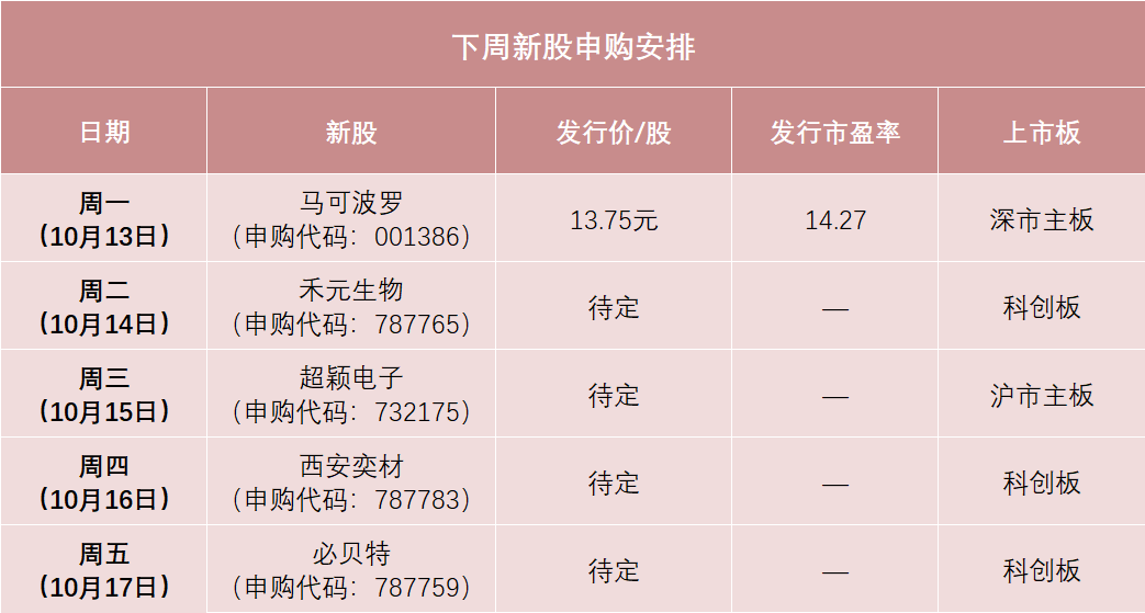 从日程安排看,下周每个交易日都有一只新股申购。值得一提的是,周一的深市主板新股马可波罗、周四的科创板新股西安奕材,新股发行数量都比较多,中签率可能较高。