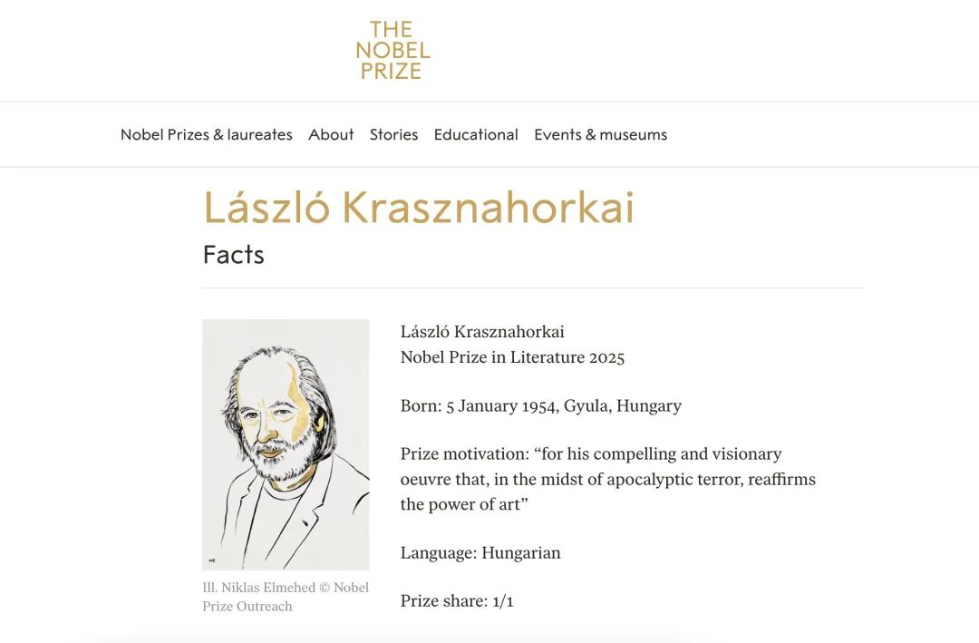 当地时间2025年10月9日13:00(北京时间19:00),瑞典学院将2025年诺贝尔文学奖颁给了匈牙利作家拉斯洛·卡撒兹纳霍凯,以表彰其“在末世恐惧中仍能通过震撼人心且具先知般洞察力的作品,重申艺术力量”的杰出成就。
