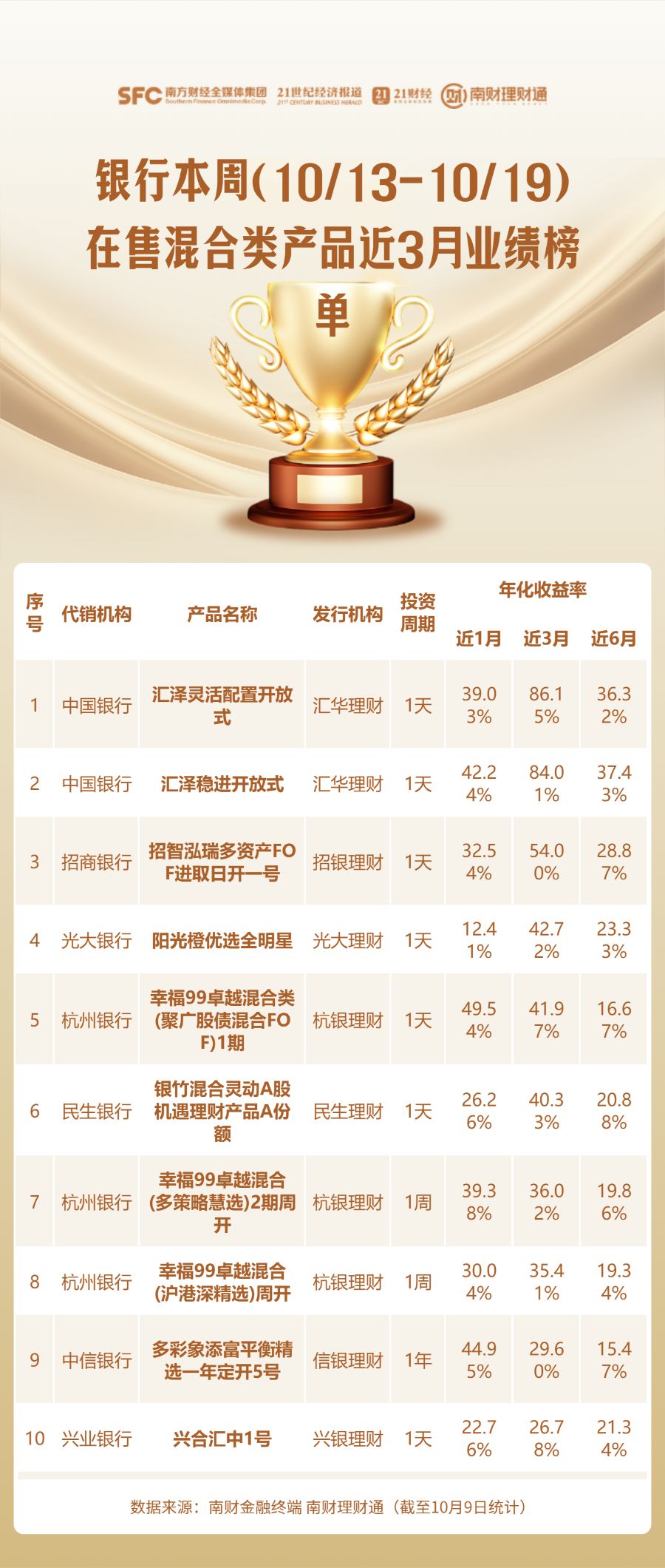 编者按:当前银行理财货架产品琳琅满目,诸如“增强”“稳健”“均衡”等名称相近、特征模糊的产品层出不穷,投资者应如何甄别与选择?为降低投资者的选择成本,南财理财通课题组从代销机构角度入手,聚焦各渠道当周在售的理财产品,搜罗其中业绩表现优异者,并发布代销产品业绩榜单。