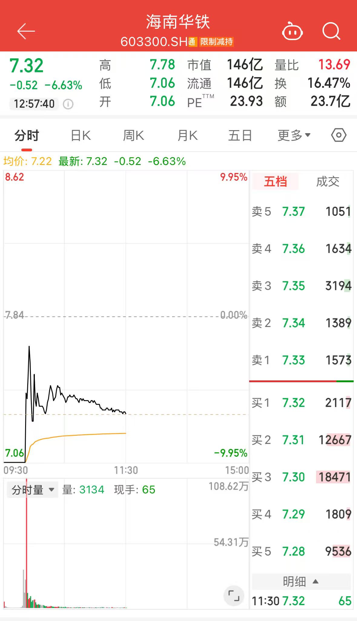 10月13日,海南华铁(603300.SH)打开跌停板,截至午盘跌6.63%,报7.32元/股,主力净流出1.21亿元,总市值146亿元。