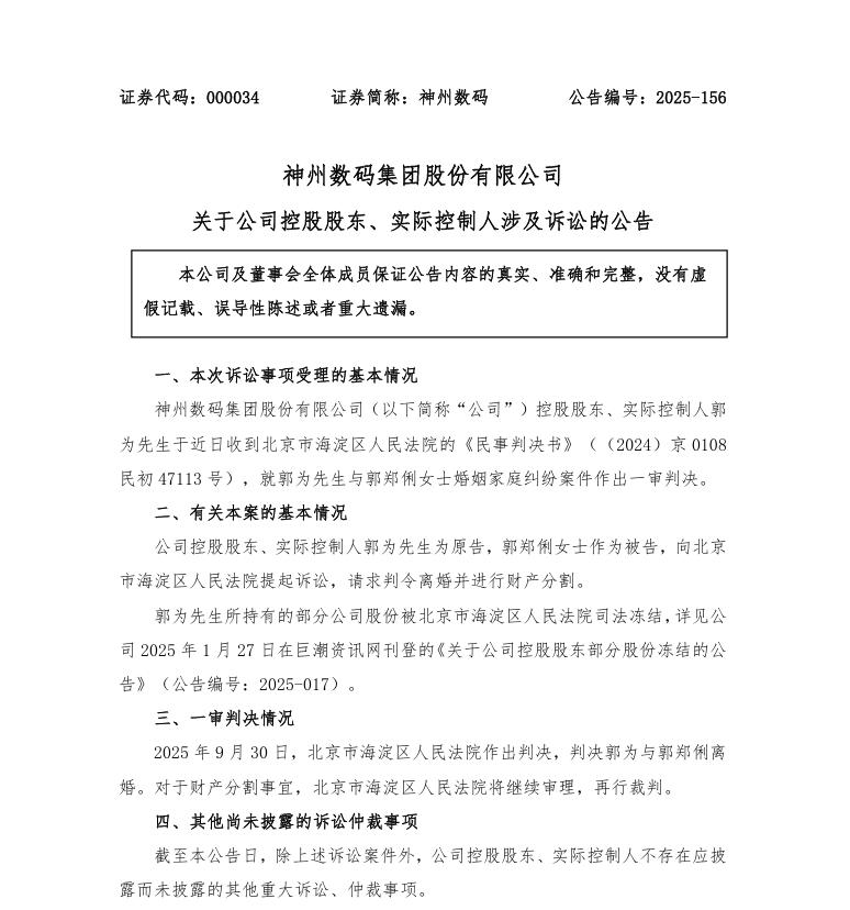 公告显示,公司控股股东、实际控制人郭为与妻子郭郑俐的婚姻家庭纠纷案件,经北京市海淀区人民法院审理,已于2025年9月30日作出一审判决,法院判令准许郭为与郭郑俐离婚。