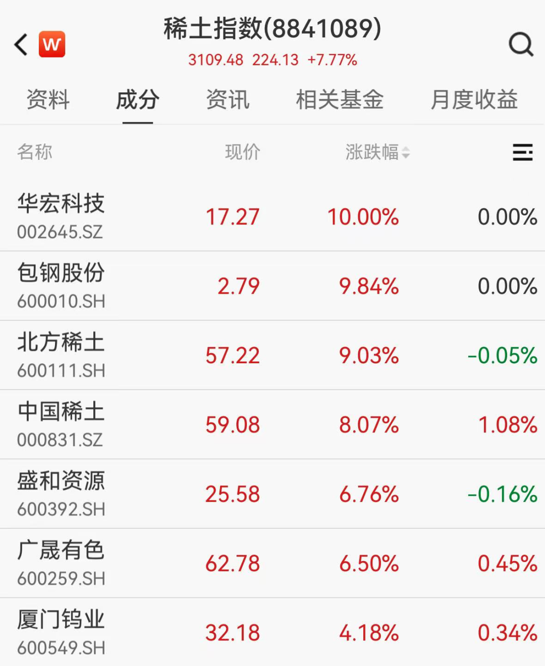 稀土概念股早盘走势活跃,截至午间收盘,Wind稀土指数(8841089)涨7.77%,成份股方面,华宏科技、包钢股份涨停,北方稀土、中国稀土涨幅居前。