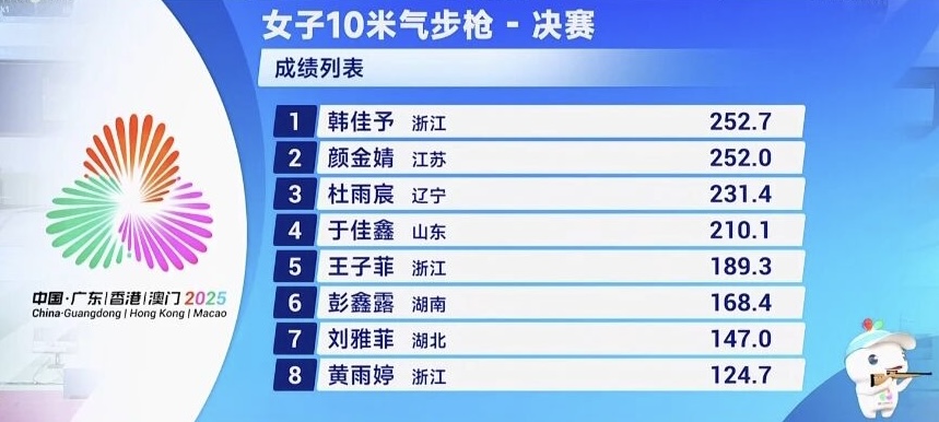 值得一提的是,在女子10米气步枪团体资格赛中,浙江队韩佳予、黄雨婷、王子菲以1903.6环的总成绩,超过了中国队在2025年射击亚锦赛中创造的1902.0环的团体世界纪录。该项目决赛将于10月14日12点进行,浙江队的三位姑娘将向金牌发起冲击。