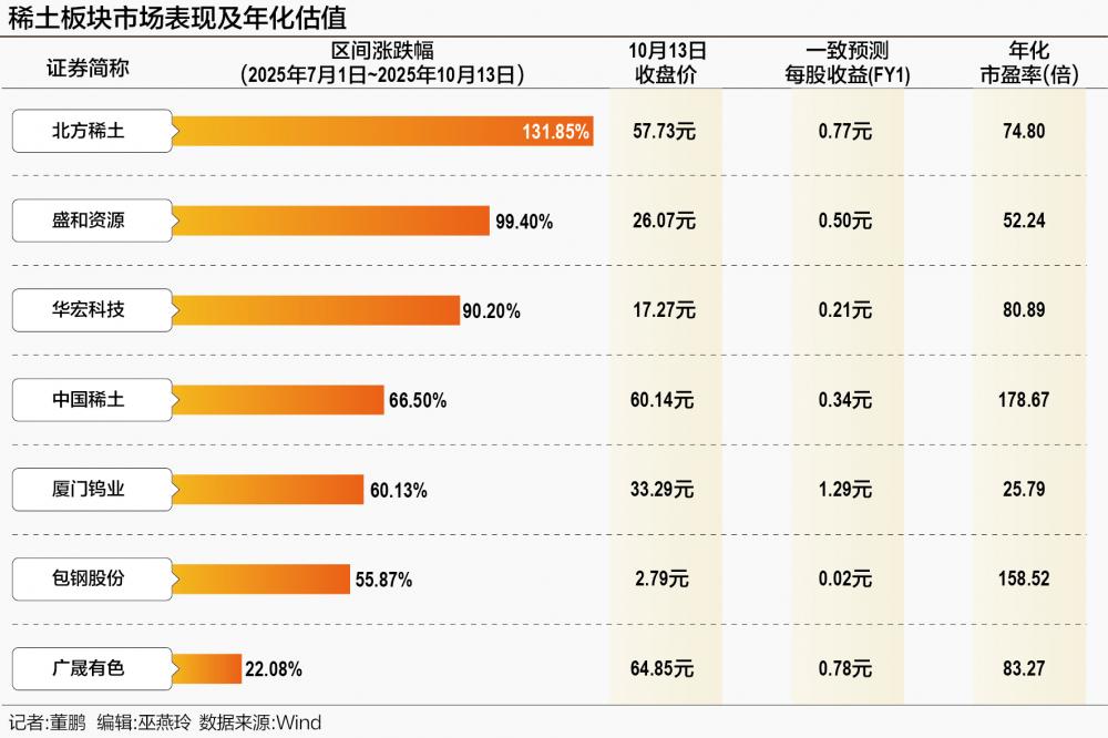 以北方稀土为例。截至13日收盘,该公司年内涨幅超过170%,如果按照全年28亿元的卖方盈利预期值估算,公司当前估值已经达到75倍,而估值超过百倍的稀土股亦不罕见。