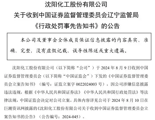 辽宁证监局拟决定对沈阳化工给予警告,并处以700万元的罚款;对孙泽胜、李忠、杨林、姜立辉、冷昭甲分别给予警告,并处以不同金额的罚款。
