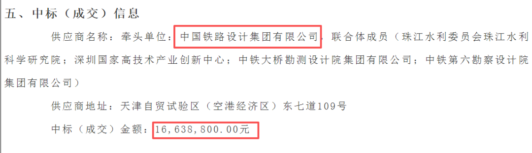 据公告显示,中标供应商牵头单位为 中国铁路设计集团有限公司 ,联合体成员(珠江水利委员会珠江水利科学研究院,深圳国家高技术产业创新中心,中铁大桥勘测设计院集团有限公司,中铁第六勘察设计院集团有限公司)中标,中标(成交)金额 1663.88万元 。