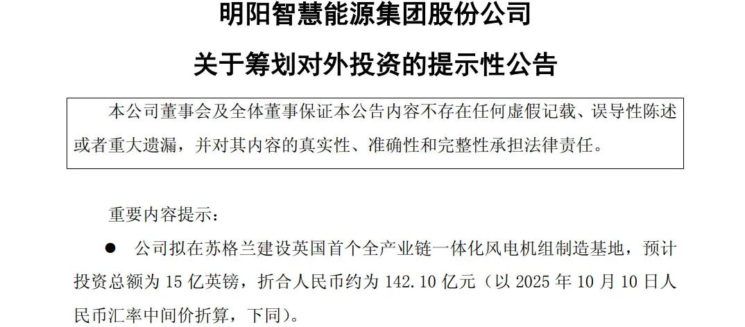 9月12日晚,张传卫掌舵的明阳智能公告称,拟建设英国首个全产业链一体化风电机组制造基地,预计投资15亿英镑,折合人民币超140亿元。