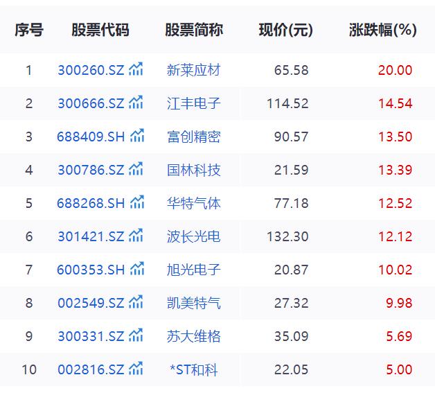 其中,联合化学(301209.SZ)、凯美特气(002549.SZ)、腾景科技(688195.SH)、旭光电子(600353.SH)、炬光科技(688167.SH)、芯碁微装(688630.SH)、波长光电(301421.SZ)、茂莱光学(688502.SH)新莱应材(300260.SZ)9家公司股价成功实现翻倍。