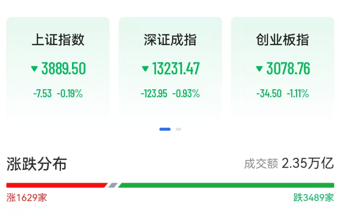 周一A股三大指数震荡回升,截至收盘,沪综指跌0.19%,收报3889.50点;深证成指跌0.93%,收报13231.47点;创业板指跌1.11%,收报3078.76点。沪深两市成交额达到23548亿元,较上一交易日缩量1609亿元。行业板块涨少跌多,稀土永磁、贵金属、能源金属、电子化学品、半导体板块涨幅居前,汽车零部件、消费电子、电机、游戏、文化传媒板块跌幅居前。个股方面,上涨股票数量1684只,73只股票涨停,3634只股票下跌。