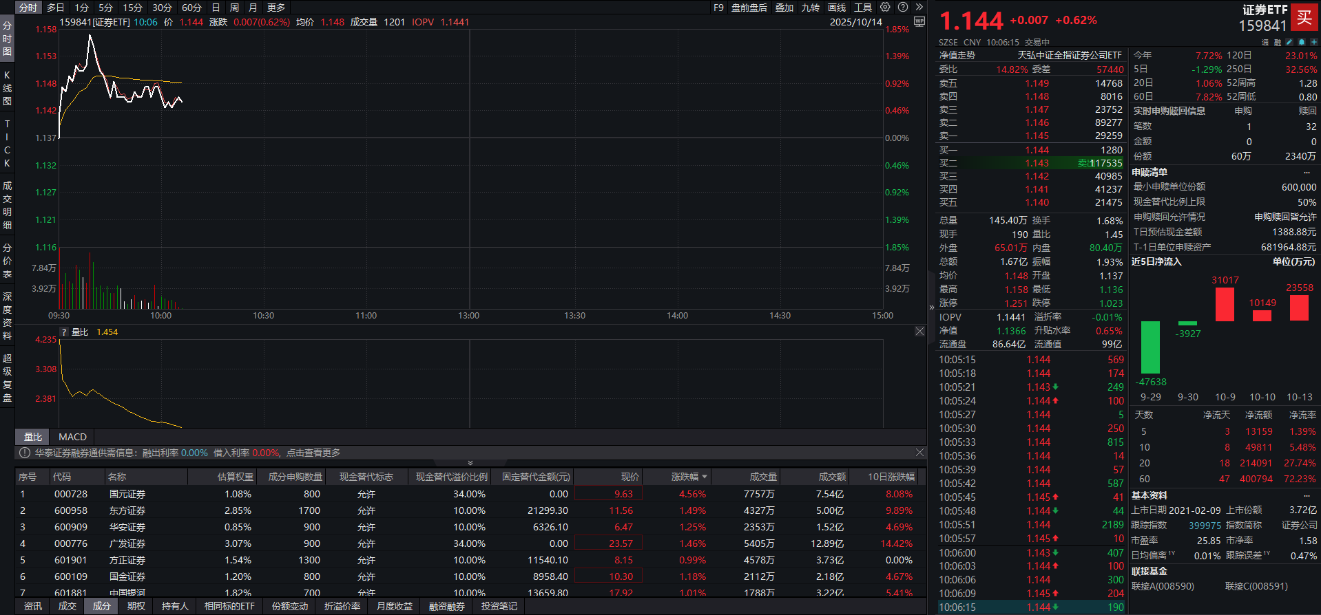 基金份额来看,Wind数据显示,截至10月13日,证券ETF(159841)最新流通份额为86.64亿份,流通规模为98.48亿元,规模居深市同标的产品首位。