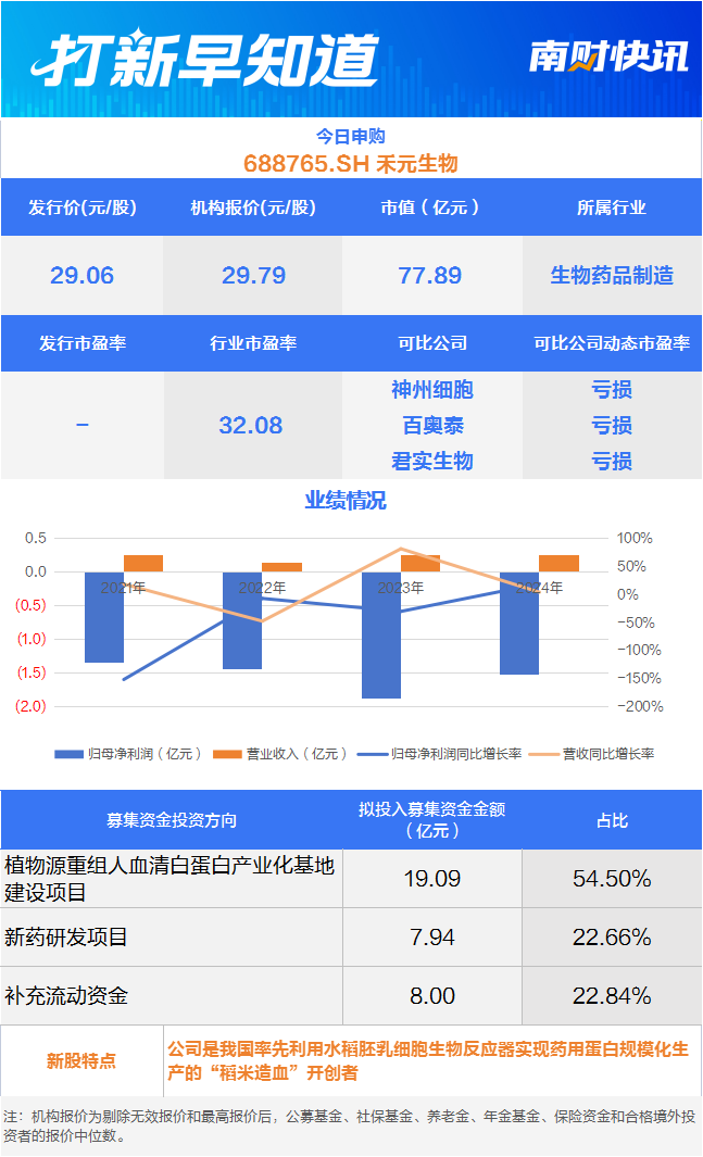 10月14日,可申购科创板新股禾元生物(688765.SH)。该公司主要从事植物源重组蛋白表达技术研究与产品开发,拥有全球领先的植物生物反应器技术平台,公司基于水稻胚乳细胞生物反应器的表达体系开发了多款药品、药用辅料及科研试剂等产品。公司被誉为“稻米造血”行业开创者。