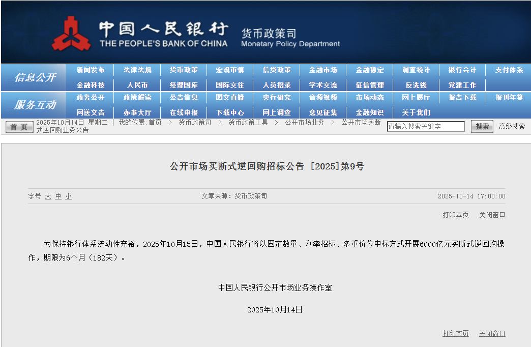 央行发布公开市场买断式逆回购招标公告,2025年10月15日,中国人民银行将以固定数量、利率招标、多重价位中标方式开展6000亿元买断式逆回购操作,期限为6个月(182天)。