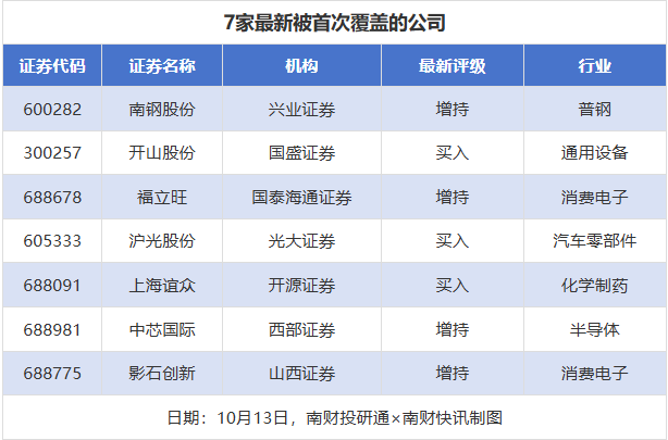 首次覆盖方面,10月13日券商共给出了7次首次覆盖,其中南钢股份获得兴业证券给予“增持”评级,开山股份获得国盛证券给予“买入”评级,福立旺获得国泰海通证券给予“增持”评级,沪光股份获得光大证券给予“买入”评级,上海谊众获得开源证券给予“买入”评级。