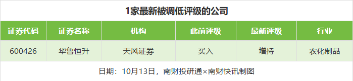 评级调低方面,10月13日,券商调低1家上市公司评级,天风证券对华鲁恒升的评级从“买入”调低至“增持”。