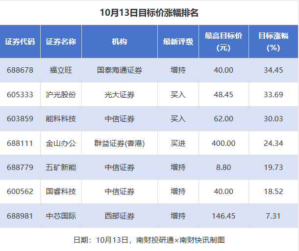 南财投研通数据显示,10月13日,券商给予上市公司目标价共7次,按最新收盘价计算,目标价涨幅排名居前的公司有福立旺、沪光股份、能科科技,目标价涨幅分别为34.45%、33.69%、30.03%,分别属于消费电子、汽车零部件、IT服务行业。