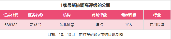 评级调高方面,10月13日,券商调高1家上市公司评级,东北证券对新益昌的评级从“增持”调高至“买入”。