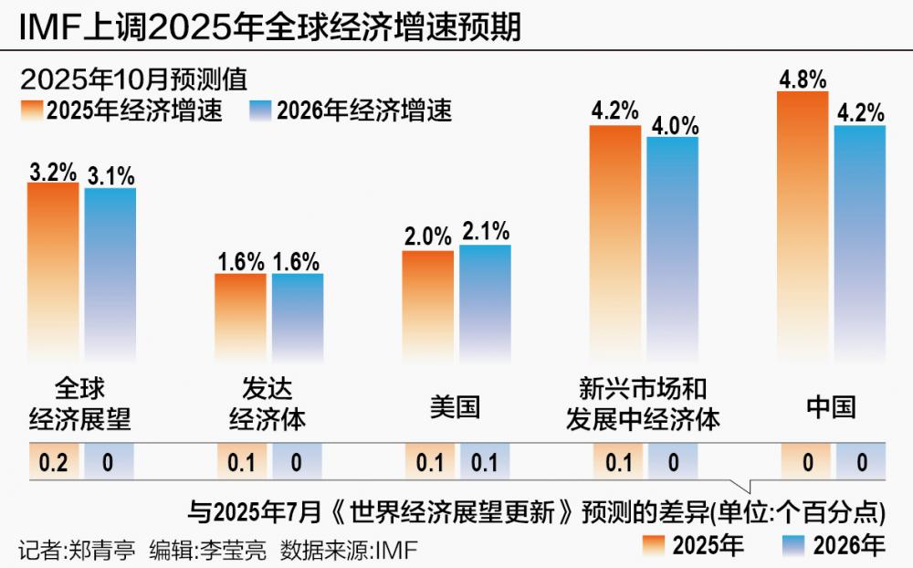 在美国贸易和关税政策的反反复复之下,2025年成为全球经济高度动荡的一年。10月14日,国际货币基金组织(IMF)在最新一期《世界经济展望》中预测,全球增长预计将从2024年的3.3%减速至2025年的3.2%和2026年的3.1%。与2025年7月《世界经济展望更新》相比,本次增长预测变化不大(仅今年的增速被小幅上调0.2个百分点),反映了全球经济对贸易紧张局势的逐步适应。