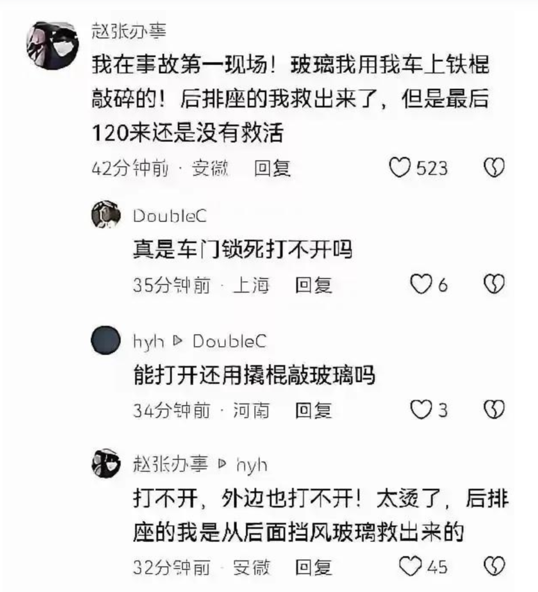 更何况在车辆已经燃烧的状态下,路过的车主们几乎不可能顶着烈焰将手伸进车内拉开机械拉手解锁车门。