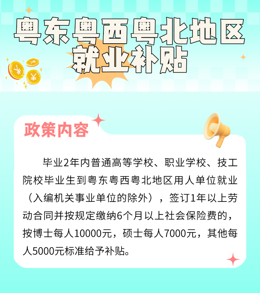 在广东省内普通高等学校、中等职业学校、技工院校就读的毕业学年学生,具有以下情形之一,可申请求职创业补贴,补贴标准为每人3000元。
