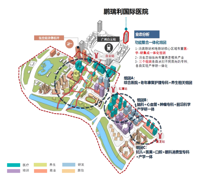 作为标杆启动项目,首期“白云鹏瑞利国际医院” 已落户于广州白云站TOD粤胜广场东南塔,总面积10.6万平方米,总投资额10亿元,并将于2026年年底全面投入运营。