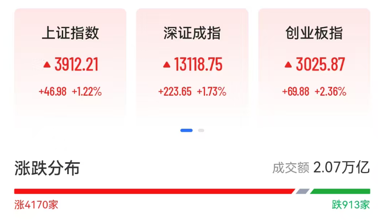周三A股三大指数震荡回升,沪指收复3900点整数关口。截至收盘,沪综指上涨1.22%,收报3912.21点;深证成指上涨1.73%,收报13118.75点;创业板指上涨2.36%,收报3025.87点。沪深两市成交额达到20729亿元,较上一交易日大幅缩量5034亿元。行业板块呈现普涨态势,汽车整车、航空机场、电网设备、化学制药、汽车零部件、电机、生物制品、医疗服务、电源设备板块涨幅居前,仅航运港口、小金属板块逆市下跌。个股方面,上涨股票数量超过4300只,逾80只股票涨停。