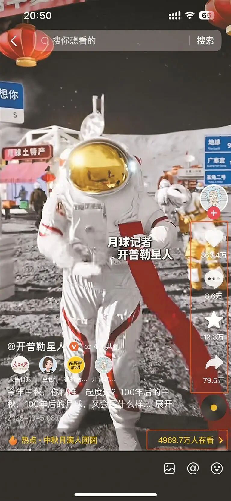 月球上怎么过中秋?“开普勒星人”脑洞大开。李锴滨介绍,团队每年中秋都会做一条月球小镇过中秋的视频内容。此次与抖音、《人民日报》共创《100年后月球上的中秋节》,视频中融入了全国不同地域过中秋的情形,中秋主题再加上地域文化元素,更接地气,引发共鸣,视频已有300多万点赞量,也是账号成立至今播放量最高的一个视频。