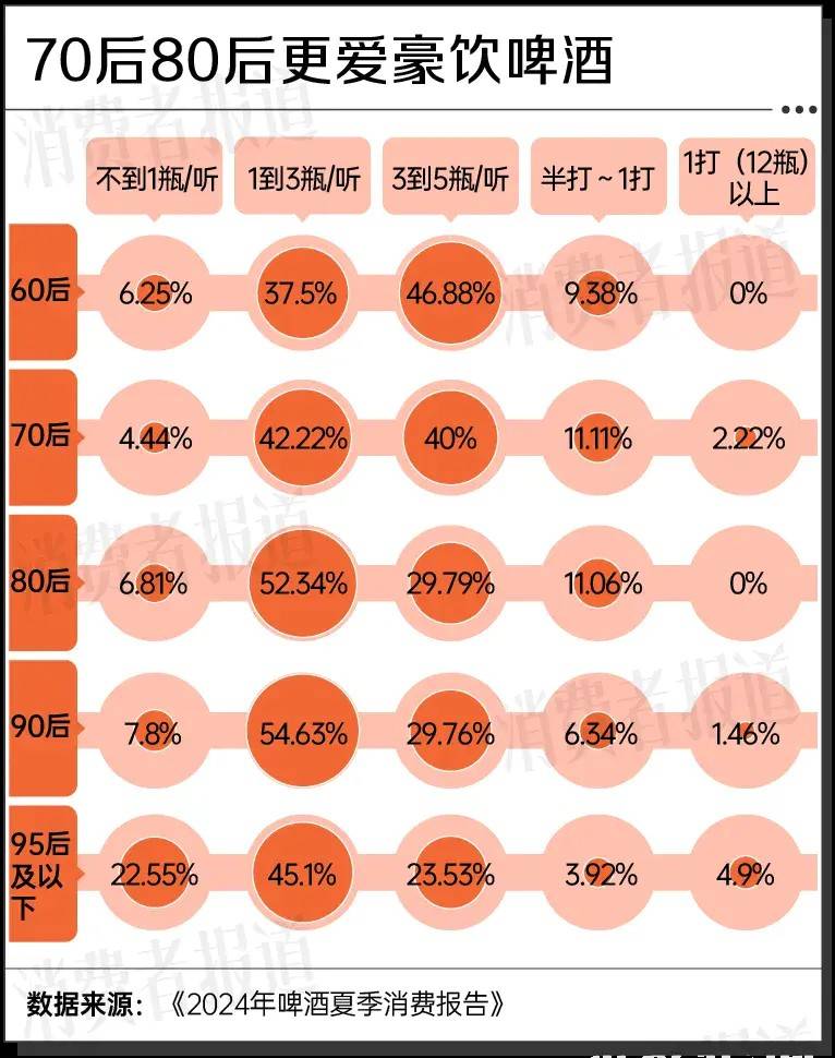 根据《消费者报道》发起的“2024年啤酒夏季消费问卷调查”,结果显示,超过30%的消费者保持着每周两到三次的啤酒饮用频率,将近40%的消费者保持着以月为单位的饮用频率。这其中,更多的80后保持着每天饮用的习惯,但更多的90后、95后则更习惯保持每周两到三次的饮酒频率,在繁忙的工作与短暂的微醺之间寻求微妙的平衡。