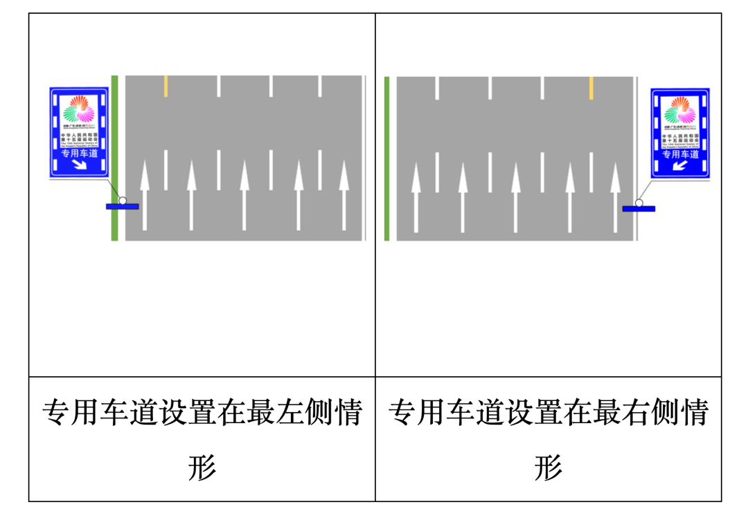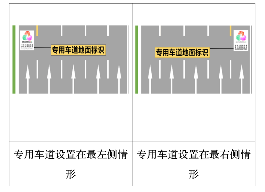 十五运会和残特奥会专用车道设置在道路顺行方向最左侧或最右侧机动车道,由专用车道标线、地面标识和标志组成,具体样式如下: