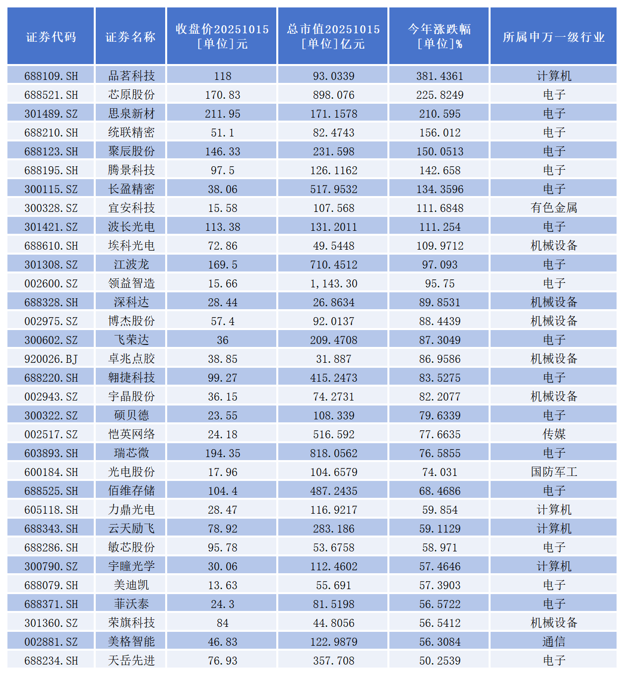 从二级市场表现看,今年以来,截至10月15日收盘,一共有115家上市公司股价出现上涨,32家上市公司股价涨幅超过50%。