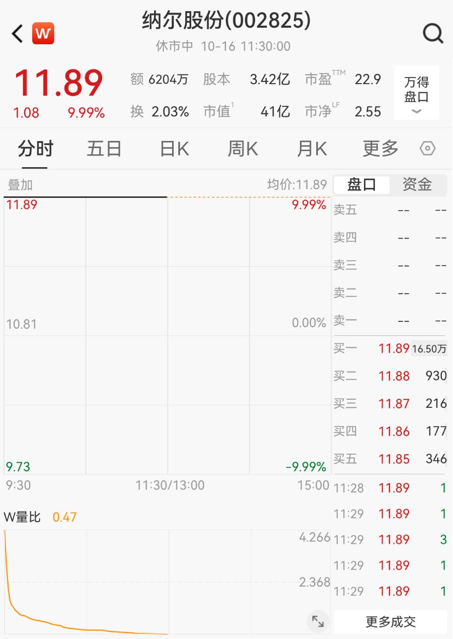 10月16日,纳尔股份(002825.SZ)股价涨停,截至午盘,报11.89元/股。