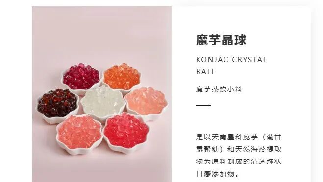 △图片来源:一致魔芋官网魔芋生产企业也敏锐地嗅到了商机,研发出了魔芋晶球、魔芋冻等小料,同时还为茶饮品牌提供魔芋零食的代工,魔芋逐渐渗透进了新茶饮领域。