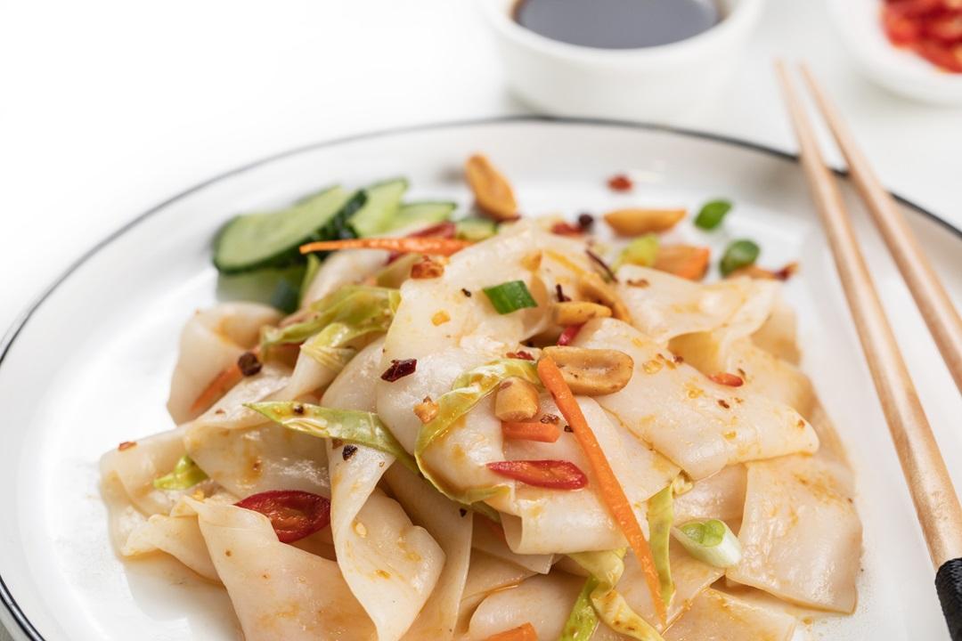 在餐饮店里,用魔芋做的主食不胜枚举,包括魔芋粉、魔芋面、魔芋凉皮、魔芋饺子等等。因为魔芋富含葡甘聚糖(一种可溶性膳食纤维,吸水后能大幅膨胀),该物质不易消化,能产生明显饱腹感,且热量低,故而魔芋也是轻食店常用的食材。