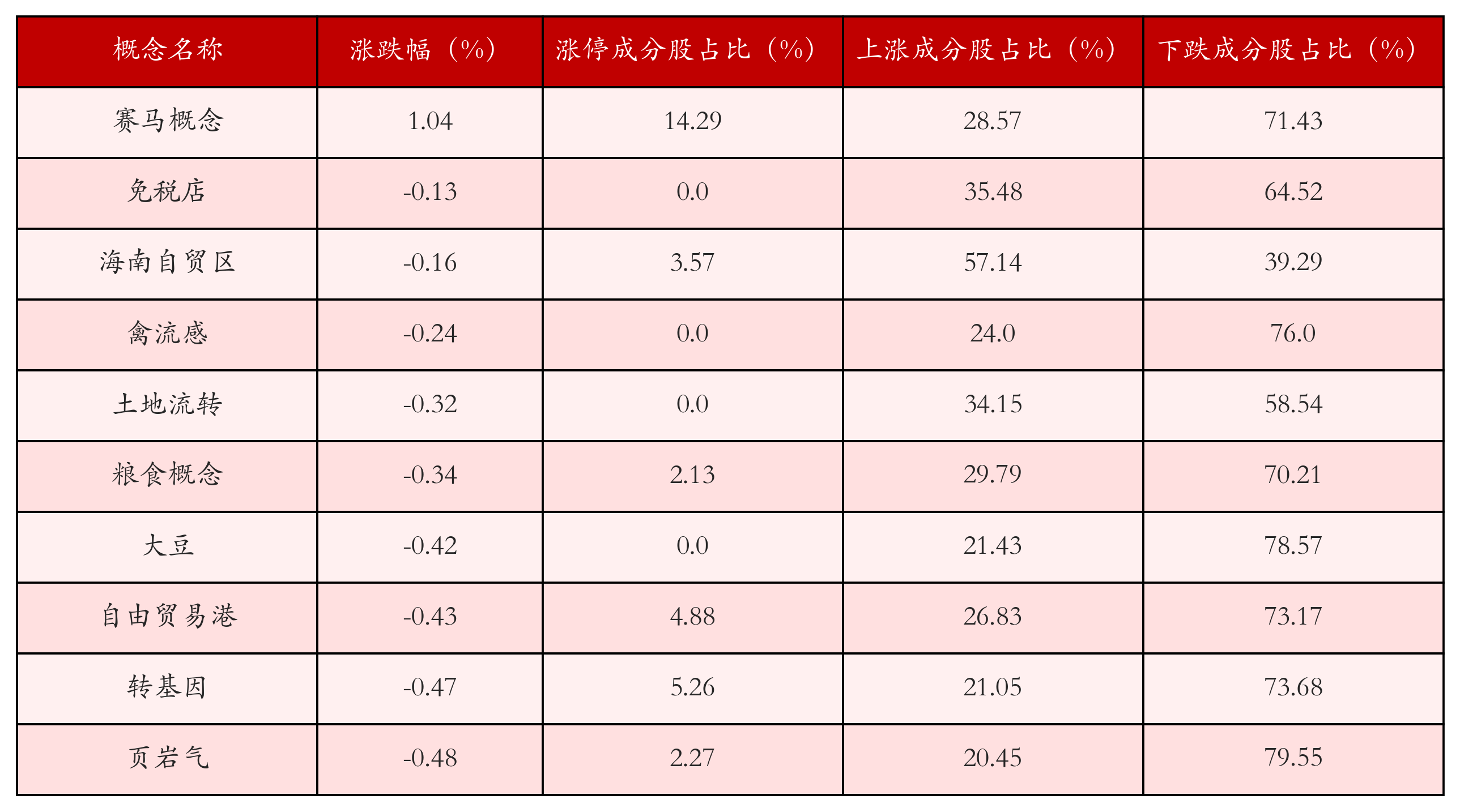 根据A股概念涨跌幅与所对应的股票池综合分析,涨幅靠前的三个概念板块分别为:赛马概念、免税店与海南自贸区。排名前10位的概念板块相关数据见下表: