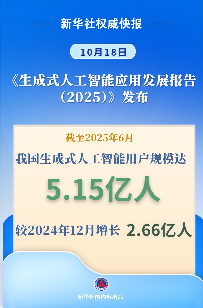 10月18日,中国互联网络信息中心在2025(第六届)中国互联网基础资源大会上发布《生成式人工智能应用发展报告(2025)》。报告显示,截至2025年6月,我国生成式人工智能用户规模达5.15亿人,较2024年12月增长2.66亿人,用户规模半年翻番;普及率为36.5%。